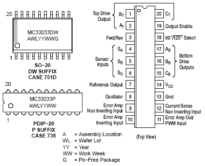 The MC33033 is a high performance second generation, limited feature, monolithic brushless dc motor controller which has evolved from the full featured MC33034 and MC33035 controllers. It contains all of the active functions required for the implementation of open loop, three or four phase motor control. The device consists of a rotor position decoder for proper commutation sequencing, temperature compensated reference capable of supplying sensor power, frequency programmable sawtooth oscillator, fully accessible error amplifier, pulse width modulator comparator, three open collector top drivers, and three high current totem pole bottom drivers ideally suited for driving power MOSFETs. Unlike its predessors, it does not feature separate drive circuit supply and ground pins, brake input, or fault output signal.