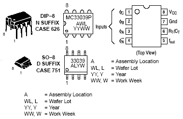 The MC33039 is a high performance closed–loop speed control adapter specifically designed for use in brushless DC motor control systems. Implementation will allow precise speed regulation without the need for a magnetic or optical tachometer. This device contains three input buffers each with hysteresis for noise immunity, three digital edge detectors, a programmable monostable, and an internal shunt regulator. Also included is an inverter output for use in systemsthat require conversion of sensor phasing. Although this device is primarily intended for use with the MC33035 brushless motor controller, it can be used cost effectively in many other closed–loop speed control applications.