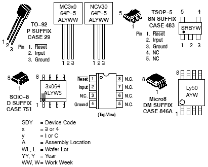 The MC33064/MC34064 is an undervoltage sensing circuit specifically designed for use as a reset controller in microprocessor-based systems. It offers the designer an economical solution for low voltagedetection with a single external resistor. The MC33064/MC34064 features a trimmed-in-package bandgap reference, and a comparator with precise thresholds and built-in hysteresis to prevent erratic reset operation. The open collector reset output is capable of sinking in excess of 10 mA, and operation is guaranteed down to 1.0 V input with low standby current. The MC devices are packaged in 3-pinTO-226AA, 8-pin SO-8,Micro-8 and 5pin SOT-23/TSOP-5 surface mount packages. The NCV device is packaged in SO-8 and TO-226AA.