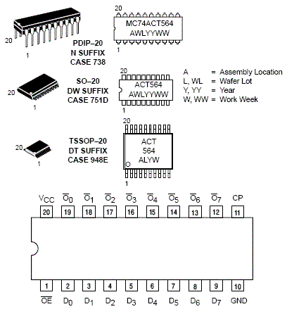 The MC74ACT564 is a high–speed, low power octal flip–flop with a buffered common Clock (CP) and a buffered common Output Enable (OE).The information presented to the D inputs is stored in the flip–flops on the LOW–to–HIGH Clock (CP) transition.The MC74ACT564 device is functionally indentical to the MC74ACT574, but with inverted outputs.