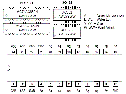 The MC74AC/ACT652 consists of registered bus transceiver circuits, with outputs, D-type flip-flops and control circuitry providing multiplexed transmission of data directly from the input bus or from the internal storage registers. Data on the A or B bus will be loaded into the respective registers on the LOW-to-HIGH transition of the appropriate clock pin (CAB or CBA).