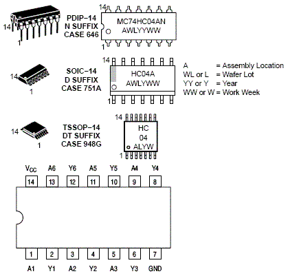 The MC74HC04A is identical in pinout to the LS04 and the MC14069. The device inputs are compatible with Standard CMOS outputs; with pullup resistors, they are compatible with LSTTL outputs.
