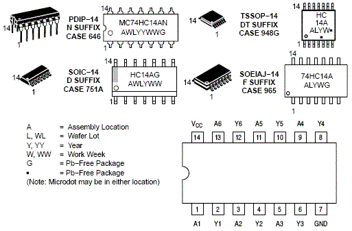 The MC74HC14A is identical in pinout to the LS14, LS04 and the HC04. The device inputs are compatible with Standard CMOS outputs; with pullup resistors, they are compatible with LSTTL outputs.