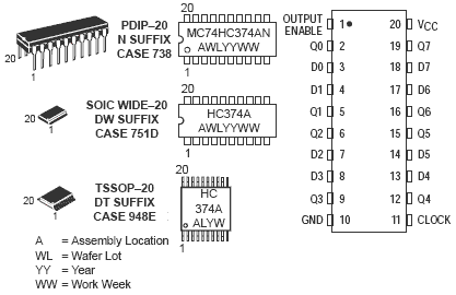 The MC74HC374A is identical in pinout to the LS374. The device inputs are compatible with standard CMOS outputs; with pullup resistors, they are compatible with LSTTL outputs.