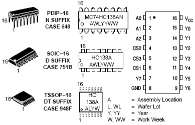 The MC74HCT138A is identical in pinout to the LS138. The HCT138A may be used as a level converter for interfacing TTL or NMOS outputs to High Speed CMOS inputs. The HCT138A decodes a three bit Address to one of eight active lot outputs. This device features three Chip Select inputs, two active low and one active high to facilitate the demultiplexing, cascading, and chip selecting functions. The demultiplexing function is accomplished by using the Address inputs to select the desired device output; one of the Chip Selects is used as a data input while the other Chip Selects are held in their active states.