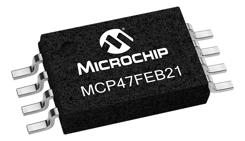 MCP47FEB21 is a single channel, 12-bit, voltage output Digital-to-Analog Converter with EEPROM and an I2C Compatible Serial Interface. This device provides four different voltage reference options: device VDD, external VREF (buffered or unbuffered) and internal bandgap. It offers high AC performance, low power consumption and fast settling time. The device has integrated EEPROM to save DAC settings at power down. It is suitable for consumer and industrial applications, such as set point control, offset adjustment and sensor calibration applications, and portable instrument.