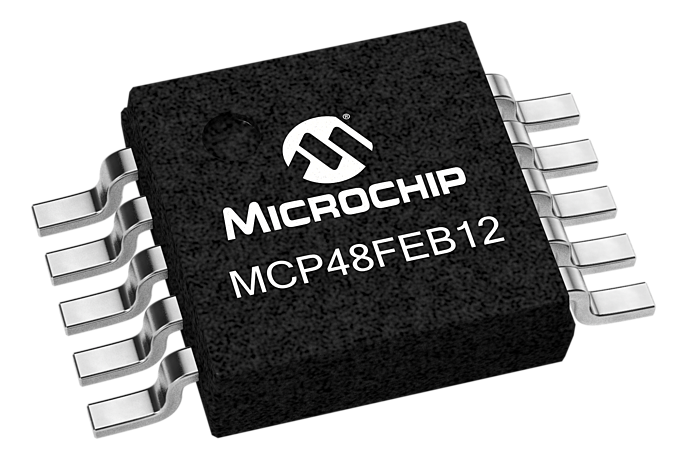 MCP48FEB12 is a dual channel, 10-bit, voltage output Digital-to-Analog Converter with EEPROM and an SPI Compatible Serial Interface. This device provides four different voltage reference options: device VDD, external VREF (buffered or unbuffered) and internal bandgap. It offers high AC performance, low power consumption and fast settling time. The device has integrated EEPROM to save DAC settings at power down. It is suitable for consumer and industrial applications, such as set point control, offset adjustment and sensor calibration applications, and portable instrument.