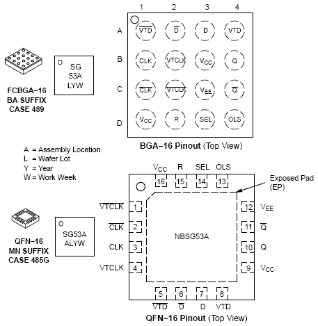 The NBSG53A is a multi-function differential D flip-flop (DFF) or fixed divide by 2 (DIV/2) clock generator. This is part of the GigaComm family of high performance Silicon Germanium products. A strappable control pin is provided to select between the two functions. The device is housed in a low profile 4x4 mm 16-pin Flip-Chip BGA (FCBGA) package.