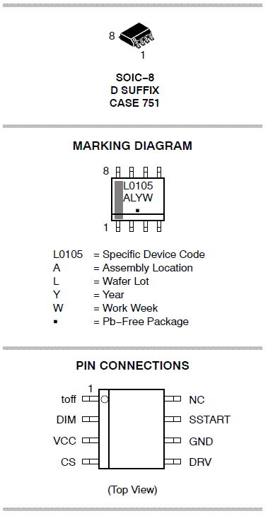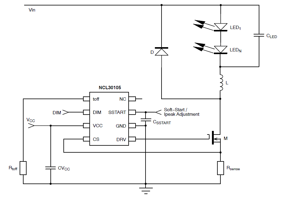 NCL30105是一款峰值电流控制固定关断时间降压控制器,用于LED驱动器应用。这器件经过了优化,采用深度连续导电模式工作,省去输出电解电容。这控制器包含可调节关断时间产生器,能以达500 kHz开关频率驱动MOSFET。专用调光引脚使这器件能够使用PWM逻辑信号来直接对LED调光。软启动引脚产生启动序列,缓慢加大峰值电流,能够调节峰值电流设定点,用于模拟调光控制。这器件还具有强固的保护特性,能够检测开关过流故障及检测最大导通时间事件。