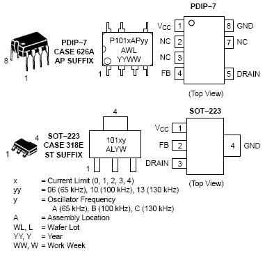 The NCP101X series integrates a fixed-frequency current-mode controller and a 700 V voltage MOSFET. Housed in a PDIP7 package, the NCP101X offers everything needed to build a rugged and low-cost power supply, including soft-start, frequency jittering, short-circuit protection, skip-cycle, a maximum peak current setpoint and a Dynamic Self-Supply (no need for an auxiliary winding).