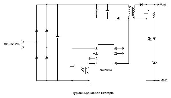 The NCP101X series integrates a fixed-frequency current-mode controller and a 700 V voltage MOSFET. Housed in a PDIP7 package, the NCP101X offers everything needed to build a rugged and low-cost power supply, including soft-start, frequency jittering, short-circuit protection, skip-cycle, a maximum peak current setpoint and a Dynamic Self-Supply (no need for an auxiliary winding).