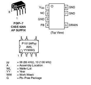 The NCP1015 integrates a fixed-frequency current-mode controller and a 700 V voltage MOSFET. Housed in a PDIP7 package, the NCP101X offers everything needed to build a rugged and low-cost power supply, including soft-start, frequency jittering, short-circuit protection, skip-cycle, a maximum peak current setpoint and a Dynamic Self-Supply (no need for an auxiliary winding).
