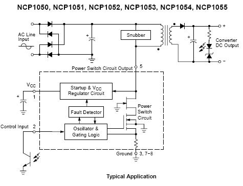 The NCP1050 through NCP1055 are monolithic high voltage regulators that enable end product equipment to be compliant with low standby power requirements. This device series combines the required converter functions allowing a simple and economical power system solution for office automation, consumer, and industrial products.These devices are designed to operate directly from a rectified AC line source. In flyback converter applications they are capable of providing an output power that ranges from 6.0 W to 40 W with a fixed AC input of 100 V, 115 V, or 230 V, and 3.0 W to 20 W with a variable AC input that ranges from 85 V to 265 V.This device series features an active startup regulator circuit that eliminates the need for an auxiliary bias winding on the converter transformer, fault logic with a programmable timer for converter overload protection, unique gated oscillator configuration for extremely fast loop response with double pulse suppression, power switch current limiting, input undervoltage lockout with hysteresis, thermal shutdown, and auto restart fault detection. These devices are available in an economical 8-pin dual-in-line package.