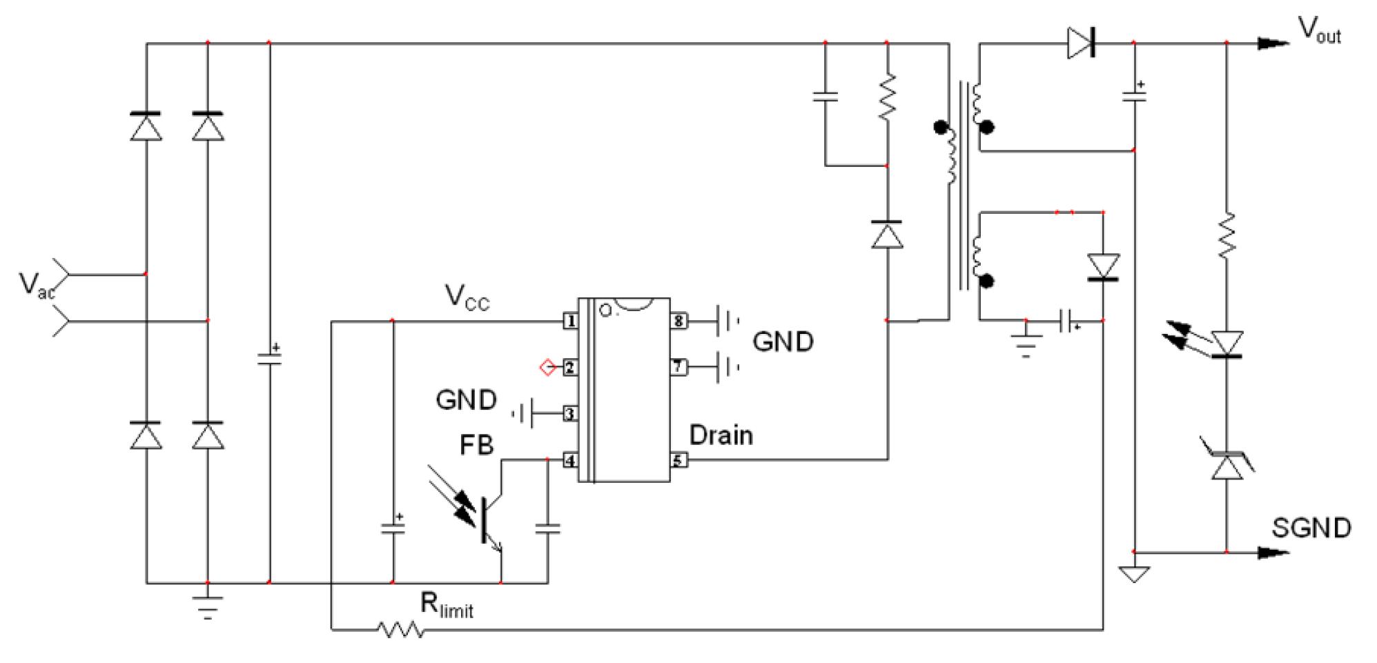 Protection features include: a timer to detect an overload or a short-circuit event, Overvoltage Protection with auto-recovery and AC input line voltage detection.
