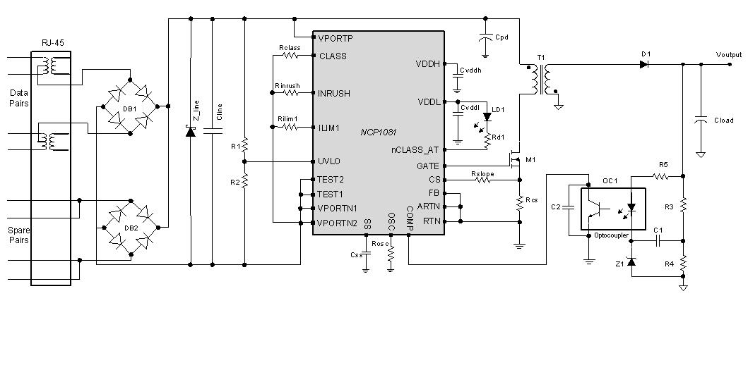 ON Semiconductor's unique manufacturing process and design enhancements allow the NCP1081 to deliver up to 25 W for the IEEE 802.3at (Draft 3.0) standard and up to 40 W for proprietary high power PoE applications. The NCP1081 is IEEE 802.3at (Draft 3.0) compliant and implements a Two Event Layer 1 classification. Additional proprietary classification procedures support high power power sourcing equipment (PSE) on the market. The unique high power features leverage the significant cost advantages of PoE-enabled systems to a much broader spectrum of products in emerging markets such as Industrial Ethernet, PTZ and Dome IP cameras, RFID, MIMO WLAN access points, notebooks, etc.
