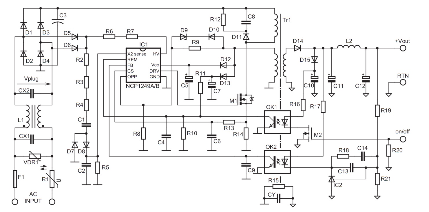 The NCP1249 is a highly integrated high-voltage PWM controller capable of delivering a rugged and high performance offline power supply with extremely low no-load consumption. With a supply range up to 30 V, the controller hosts a jittered 65-kHz switching circuitry operated in peak current mode control. When the power on the secondary side starts to decrease, the controller automatically folds back its switching frequency down to a minimum level of 26 kHz. As the power further goes down, the part enters skip cycle while freezing the peak current setpoint.
