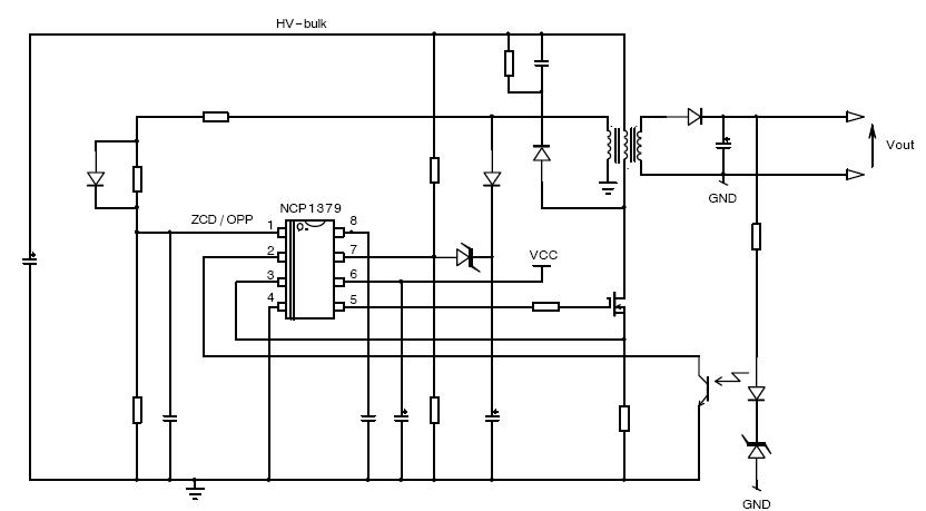 The NCP1379 is a high performance device aimed at powering quasi-resonant converters. Capitalizing on a proprietary valley lockout system, the controller shifts gears and reduces the switching frequency as the power loading becomes lighter. This results in a stable operation despite switching events always triggering in the drain-source valley. This system works down to the 4th valley and toggles to a variable frequency mode beyond, ensuring an excellent standby power performance. To improve the safety in the overload situations, the controller includes an Over Power Protection (OPP) circuit which clamps the delivered power at high-line. Safety-wise, a fixed internal timer relies on the feedback voltage to detect a fault. Once the timer elapses, the controller stops and enters auto-recovery mode, ensuring a low duty-cycle burst operation. Particularly well suited for TV power supply applications, the controller features a low startup voltage allowing use of an auxiliary supply to power the device.