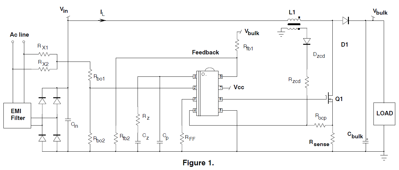 The NCP1611 is active power factor corrected (PFC) controller specifically designed for use as a boost preconverter in ac-dc adapters, flat TVs, lighting ballasts and other medium powered offline applications.The controller is based on an innovative Current Controlled Frequency Foldback(CCFF) method. In this mode, the circuit classically operates in Critical conduction Mode (CrM) when the inductor current exceeds a programmable value. When the current is below this preset level, the NCP1611 linearly reduces the frequency down to about 20 kHz when the current is at a null. CCFF maximizes the efficiency at both nominal and light load. In particular, the standby losses are reduced to a minimum.The controller features a robust suite of protection features to properly handle an array of power supply operating and fault conditions.
