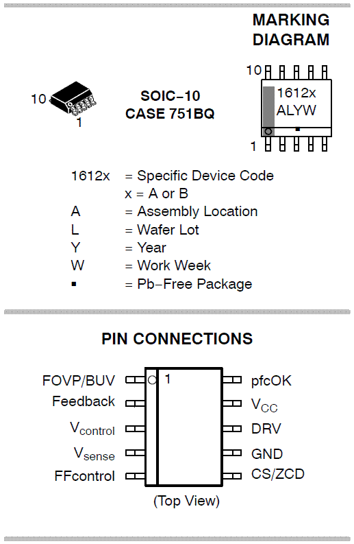 The NCP1612 is active power factor corrected (PFC) controller specifically designed for use as a boost pre-converter in ac-dc adapters, flat TVs, lighting ballasts and other medium powered offline applications. The controller is based on an innovative Current Controlled Frequency Foldback(CCFF) method. In this mode, the circuit classically operates in Critical conduction Mode (CrM) when the inductor current exceeds a programmable value. When the current is below this preset level, the NCP1612 linearly reduces the frequency down to about 20 kHz when the current is at a null. CCFF maximizes the efficiency at both nominal and light load. In particular, the standby losses are reduced to a minimum. The controller features a robust suite of protection features to properly handle an array of power supply operating and fault conditions.This device is particularly suited a PFC stage for LLC controllers due to its dedicated PFC_Okay Output.