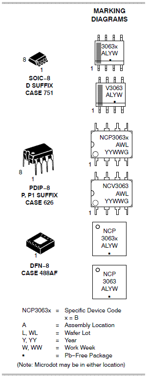 This Buck Boost Inverting Switching Regulator consists of an internal temperature compensated reference, comparator, controlled duty cycle oscillator with an active current limit circuit, driver and high current output switch. New features include an internal thermal shutdown protection and cycle-by-cycle current limit. This series was specifically designed to be incorporated in step-down (buck) and step-up (boost) and voltage-inverting applications with a minimum number of external components. The NCV3063 is available for automotive applications. See NCP3064 for product with ENABLE feature.