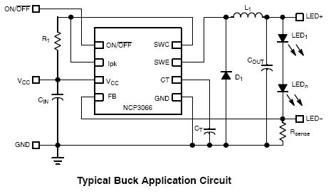 The NCP3066 is a monolithic Buck Boost Inverting Switching Regulator designed to deliver constant current for powering high brightness LEDs. The device has a very low feedback voltage of 235 mV (nominal) which is used to regulate the average current of the LED string. In addition, the NCP3066 has a wide input voltage up to 40 V to allow it to operate from 12 Vac or 12 Vdc supply, commonly used for lighting applications as well as unregulated supplies such as rechargeable batteries. The NCP3066 switching regulator can be configured in Step-Down (Buck) and Step-Up (Boost) and Voltage-Inverting topologies with a minimum number of external components. An NCV3066 automotive version is available and without the ON/OFF feature as the NCP3065.