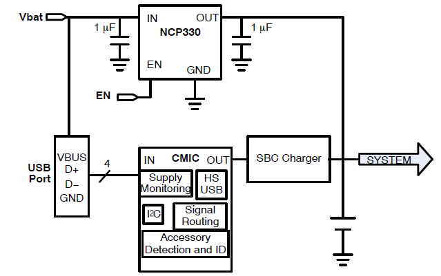 The NCP330 is a low Ron N-channel MOSFET controlled by a soft-start sequence of 2 ms for mobile applications. The very low RDS(on) allows system supplying or battery charging up to DC 3A. The device is enable automatically if a Power Supply is connected on Vin pin (active High) and maintained off if no Vin (internal pull down).