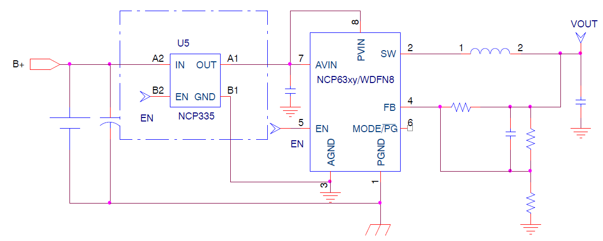 The NCP334 and NCP335 are very low Ron MOSFETs controlled by an external logic pin, allowing optimization of battery life, and portable device autonomy. Indeed, thanks to a current consumption optimization with PMOS structure, leakage currents are eliminated by isolating connected IC on the battery when not used. Output discharge path is availabale in NCP335 version.
