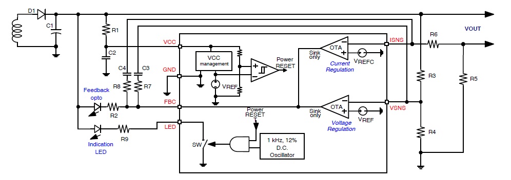 The NCP4328 is a secondary side SMPS controller designed for use in applications which requires constant current and/or constant current regulation. The NCP4328x consists of two OTA amplifiers for voltage and current loop regulation with precise internal voltage references. Outputs of OTAs are open drain type (OTAs sink current only). The NCP4328B includes a LED driver pin implemented with an open drain MOSFET driven by a 1 kHz square wave with a 12.5% duty cycle working when VCC is above UVLO for indication purpose. The NCP4328A is available in TSOP5 package while the NCP4328B is available in TSOP6 package.