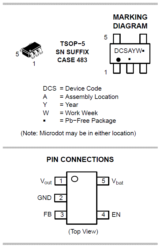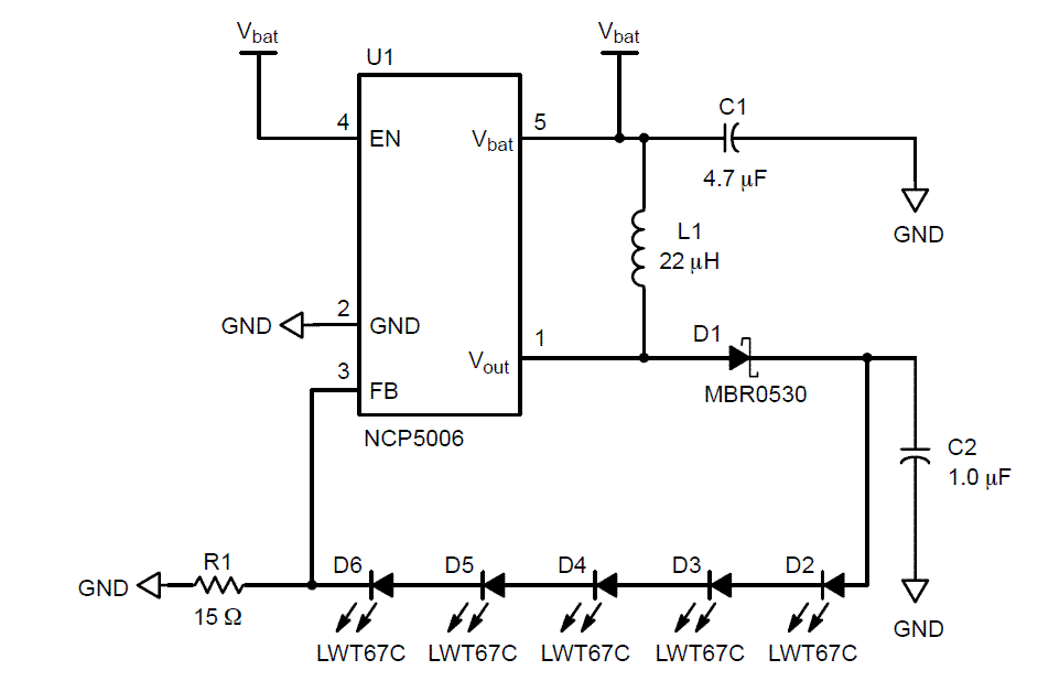 The NCP5006 is high efficiency boost converter operating in current loop, based on a PFM mode, to drive White LED. The current mode regulation allows a uniform brightness of the LEDs. The chip has been optimized for small ceramic capacitors, capable to supply up to 1.0 W output power.