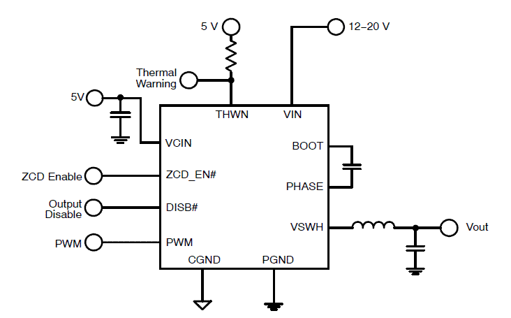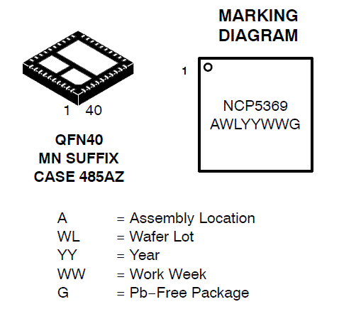 The NCP5369 integrates a MOSFET driver, high-side MOSFET and low-side MOSFET into a 6mm x 6mm 40-pin QFN package. The driver and MOSFETs have been optimized for high-current DC-DC buck power conversion applications. The NCP5369 integrated solution greatly reduces package parasitics and board space compared to a discrete component solution.