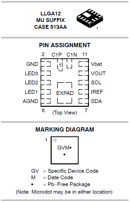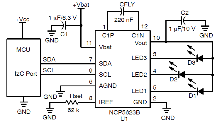 The NCP5623B mixed analog circuit is a triple output LED driver dedicated to the RGB illumination or backlight LCD display. The built in DC to DC converter is based on a high efficient charge pump structure with operating mode 1x and 2x. It provides a 94 percent peak efficiency. The tiny package makes the device suitable for room limited portable applications.