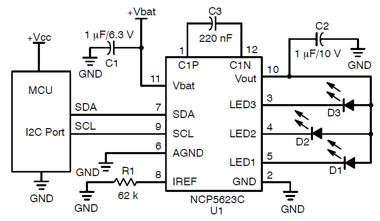 The NCP5623C mixed analog circuit is a triple output LED driver dedicated to the RGB illumination or backlight LCD display. The built in DC-DC converter is based on a high efficient charge pump structure with operating mode 1x and 2x. It provides a peak 94% efficiency. The tiny package makes the device suitable for room limited portable applications.