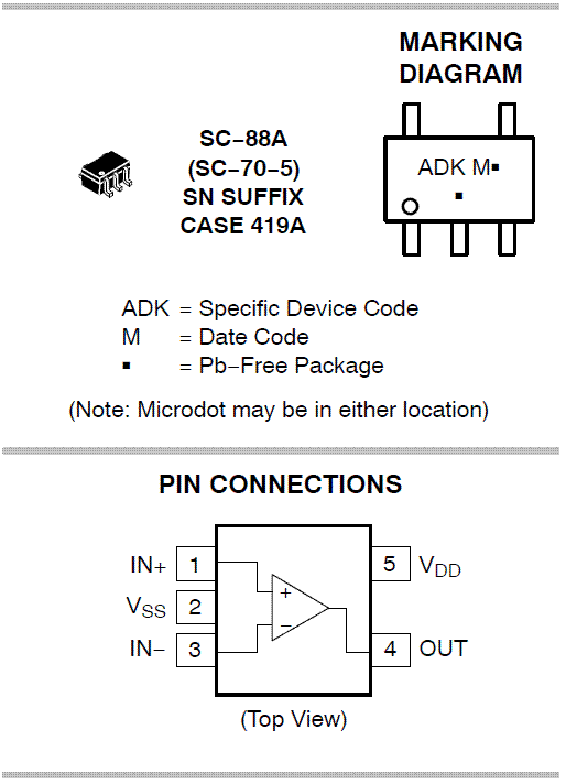 The NCS2004 operational amplifier provides rail to rail output operation. The output can swing within 70 mV to the positive rail and 30 mV to the negative rail. This rail to rail operation enables the user to make optimal use of the entire supply voltage range while taking advantage of 3.5 MHz bandwidth. The NCS2004 can operate on supply voltage as low as 2.5 V over the temperature range of -40 to plus 105°C. The high bandwidth provides a slew rate of 2.4 V per us while only consuming 390µA of quiescent current. The NCS2004 can run on a supply voltage as high as 16 V making it ideal for a broad range of battery operated applications. Since this is a CMOS device it has high input impedance and low bias currents making it ideal for interfacing to a wide variety of signal sensors. In addition it comes in a small SC-88A package allowing for use in high density PCB's.