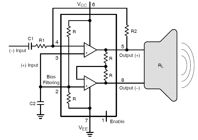 Audio Power Amplifier, Low Distortion, with Differential Output and Shutdown Mode