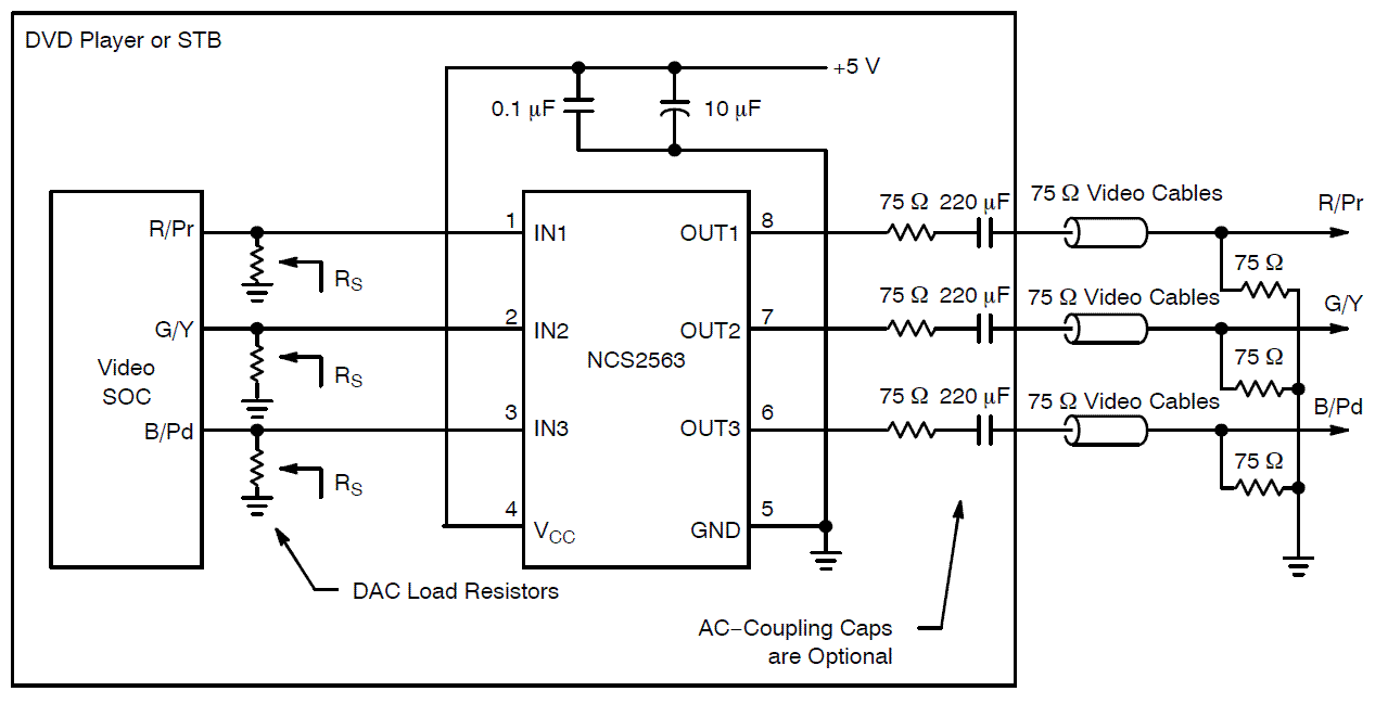 The NCS2563 is a 3-channel high speed video amplifier with 6th order Butterworth High Definition (HD) reconstruction filters and 6 dB gain. All three channels can accommodate all Component and RGB video signals. All channels can accept DC- or AC-coupled signals. If AC-coupled, the internal clamps are employed. The outputs can drive both AC- and DC-coupled 150 Ohm loads. It is designed to be compatible with most Digital-to-Analog Converters (DAC) embedded in most video processors.