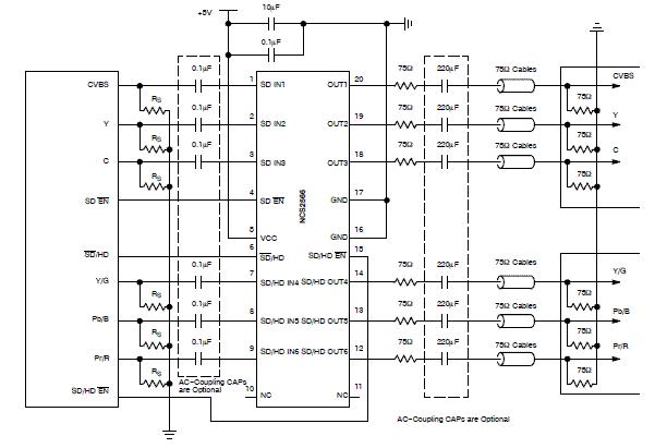 The NCS2566 integrates together reconstruction filters and video amplifiers. It is a combination of two 3-channel drivers - a first one capable to deal with SD video signals only and a second one including selectable filters for Standard Definition (SD) or High Definition (HD) video applications. The implemented filters are 6th order Butterworth Low Pass filters particularly effective for rejecting unwanted high frequency components and assuring a good linearity of the phase change over frequency with very well optimized group delays. Moreover all channels can accept dc- or ac-coupled signals, if ac-coupled the internal clamps are employed. The outputs can drive both ac- or dc- coupled 150 Ohm loads. It is designed to be compatible with most Digital-to-Analog Converters (DAC) embedded in video processors. To further reduce power consumption, two enable pins are provided, one for each triple driver. One pin allows selecting the filter frequency of the SD/HD triple driver.