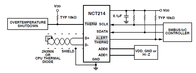C) standards. The NCT214 has two address pins which allow up to 9 NCT214s to be used on the same bus. An /ALERT output signals when the on-chip or remote temperature is out of range. The /THERM output is a comparator output that allows on/off control of a cooling fan. The /ALERT output can be reconfigured as a second /THERM output, if required.