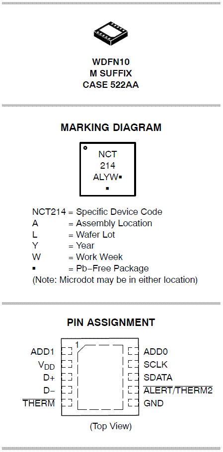 The NCT214 is a dual-channel digital thermometer and undertemperature/overtemperature alarm, intended for use in PCs and thermal management systems. It is register-compativle with the ADM1032 and ADT7461. A feature of the NCT214 is series resistance cancellation, where up to 1.5kΩ (typical) of resistance in series with the temperature monitoring diode can be automatically cancelled from the temperature result, allowing noise filtering. The NCT214 has a configurable /ALERT output and an extended, switchable temperature measurement range. The NCT214 can measure the temperature of a remote thermal diode accurate to ±1°C and the ambient temperature accurate to ±3°C. The temperature measurement range defaults to 0°C to +127°C, compatible with the ADM1032, but it can be switched to a wider measurement range of -64°C to +191°C. The NCT214 communicates over a 2-wire serial interface, compatible with system management bus (SMBus/I