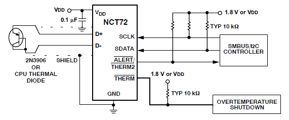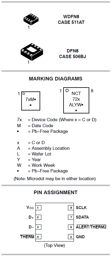 The NCT72 is a dual-channel digital thermometer and undertemperature/overtemperature alarm, intended for use in PCs and thermal management systems. It is pin and register compatible with the NCT1008 but the NCT72 allows the user to pull the /ALERT pin to 1.8V without increasin the device Idd. A feature of the NCT72 is series resistance cancellation, where up to 1.5 kΩ (typical) of resistance in series with the temperature monitoring diode can be automatically cancelled from the temperature result, allowing noise filtering. The NCT72 has a configurable /ALERT output and an extended, switchable temperature measurement range. The NCT72 can measure the temperature of a remote thermal diode accurate to ±1°C and the ambient temperature accurate to ±3°C. The temperature measurement range defaults to 0°C to +127°C, compatible with the NCT1008, but it can be switched to a wider measurement range of -64°C to +191°C. The NCT72 communicates over a 2-wire serial interface, compatible with system management bus (SMBus/I