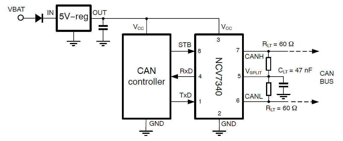 The NCV7340 CAN transceiver is the interface between a controller area network (CAN) protocol controller and the physical bus and may be used in both 12 V and 24 V systems. The transceiver provides differential transmit capability to the bus and differential receive capability to the CAN controller.