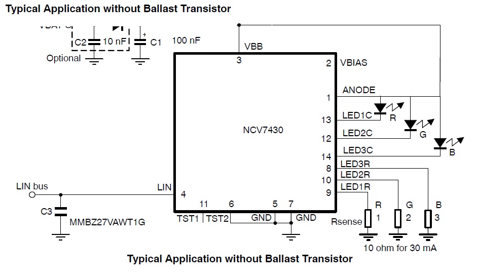 The NCV7430 is a single-chip RGB driver intended for dedicated multicolor LED applications. The RGB LED driver contains a LIN interface (slave) for parametric programming of LED color and intensity.