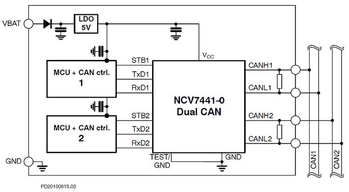 The NCV7441, dual CAN transceiver offers two fully independent high-speed CAN transceivers which can be individually connected to two CAN protocol controllers. The CAN channels can be separately put to normal or to standby mode, in which remote wakeup detection from the bus is possible.