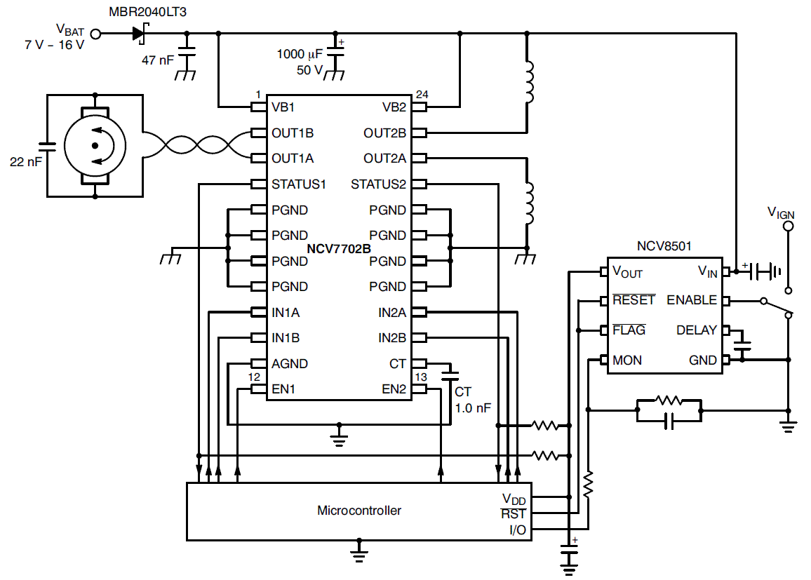 Overcurrent detection protects against shorted loads between outputs and shorts to supply or ground at each output. An overcurrent fault condition activates an internal timer, which modulates faulted outputs at low duty cycle. An overcurrent condition in one channel does not affect operation in the other. Overvoltage and overtemperature detection are also provided, and turn off all bridge outputs during these fault conditions. Recovery from all fault conditions is automatic; the IC will resume normal operation in its previously selected mode upon fault resolution. Diagnostic ability is provided by two open−collector STATUS outputs which report the fault status of each channel independently during overcurrent faults, and together during overvoltage or overtemperature faults.