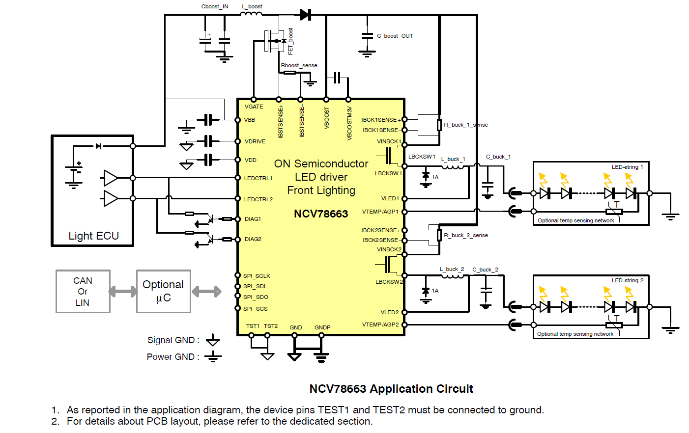 The NCV78663 is a best fit for high current LEDs and provides a complete solution to drive two strings up to 60 V, by means of two internal independent buck switch channels, with a minimum of external components.