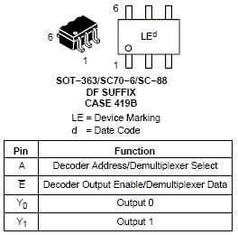 The NL7SZ19 is a 1-to-2 decoder. When the output enable (EB) is Low, the device passes data at input A to outputs Y0 (true) and Y1 (complement).The NL7SZ19 can also be used as a 1 to 2 demultiplexer. As a demultiplexer, data at input EB is routed to either Y0 or Y1 depending on the state of A.The device operates over the voltage range from 1.65 V to 5.5 V. The device is fabricated in sub-micron CMOS for high speed and fast decode times.Both inputs and outputs are in high impedance state, when supply voltage is powered down.Both inputs are tolerant of voltages up to 5.5 V, regardless of operating voltage. This device is suitable for low power decoding in a variety of applications.