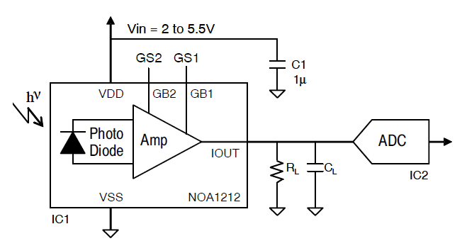 The NOA1212 is a very low power ambient light sensor (ALS) with an analog current output and a power down mode to conserve power. Designed primarily for handheld device applications, the active power dissipation of this chip is less than 8 uA at dark and its quiescent current consumption is less than 200 pA in power down mode. The device can operate over a very wide range of voltages from 2V to 5.5V. The NOA1212 employs proprietary CMOS image sensing technology from ON Semiconductor, including built-in dynamic dark current compensation to provide large signal to noise ratio (SNR) and wide dynamic range (DR) over the entire operating temperature range. The photopic optical filter provides a light response similar to that of the human eye. Together the photopic light response and dark current compensation insures accurate light level detection
