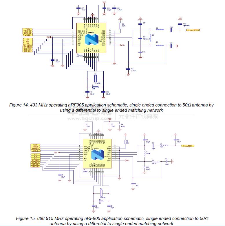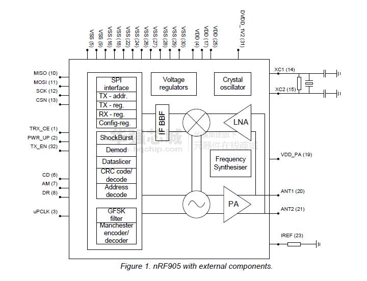 NRF905无线芯片是有挪威NORDIC公司出品的低于1GHz无线数传芯片,主要工作于433MHz、868MHz和915MHz的ISM频段。芯片内置频率合成器、功率放大器、晶体振荡器和调制器等功能模块,输出功率和通信频道可通过程序进行配置。非常适合于低功耗、低成本的系统设计。