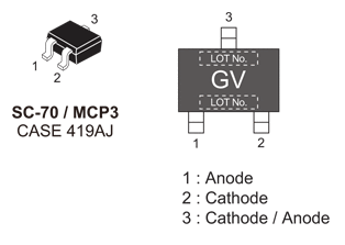 This PIN diode is designed to realize compact and efficient designs. Two PIN diodes are incorporated in one SC-70 package. The use of dual PIN diodes can reduce both system cost and board space. This PIN diode is AEC-Q101 qualified and PPAP capable for automotive applications.
