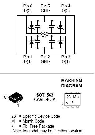 This device is a 2 line EMI filter array for wireless applications.Greater than -30 dB attenuation is obtained at frequencies from 800 MHz to 900 MHz.It also offers ESD protection-clamping transients from static discharges.ESD protection is provided across all capacitors.