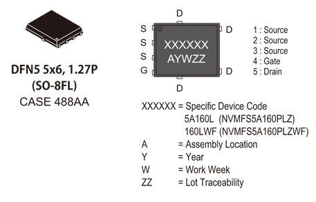 Automotive Power MOSFET in a 5 x 6 mm flat lead package designed for compact and efficient designs and including high thermal performance. Wettable Flank Option available for Enhanced Optical Inspection. AEC-Q101 Qualified MOSFET and PPAP capable suitable for automotive applications.
